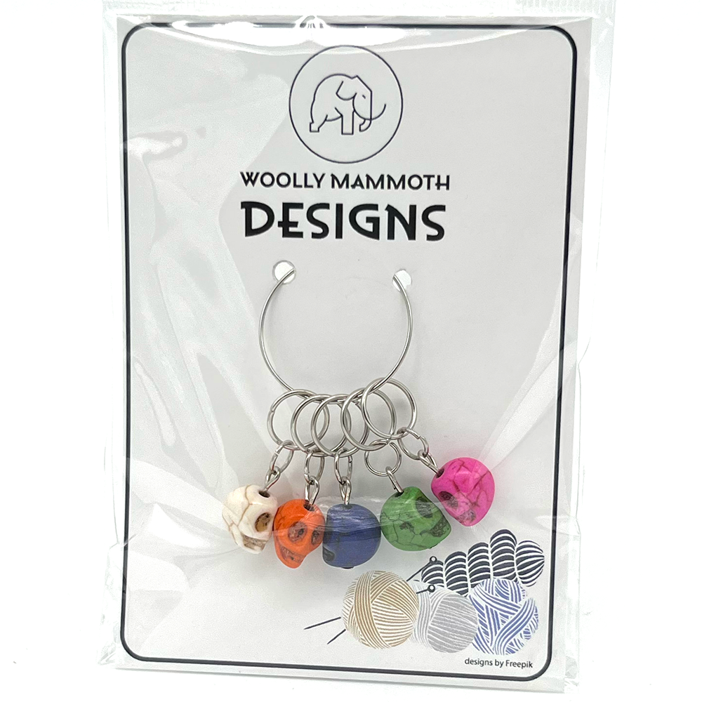 A pack of 5 stitch markers with skull charms.